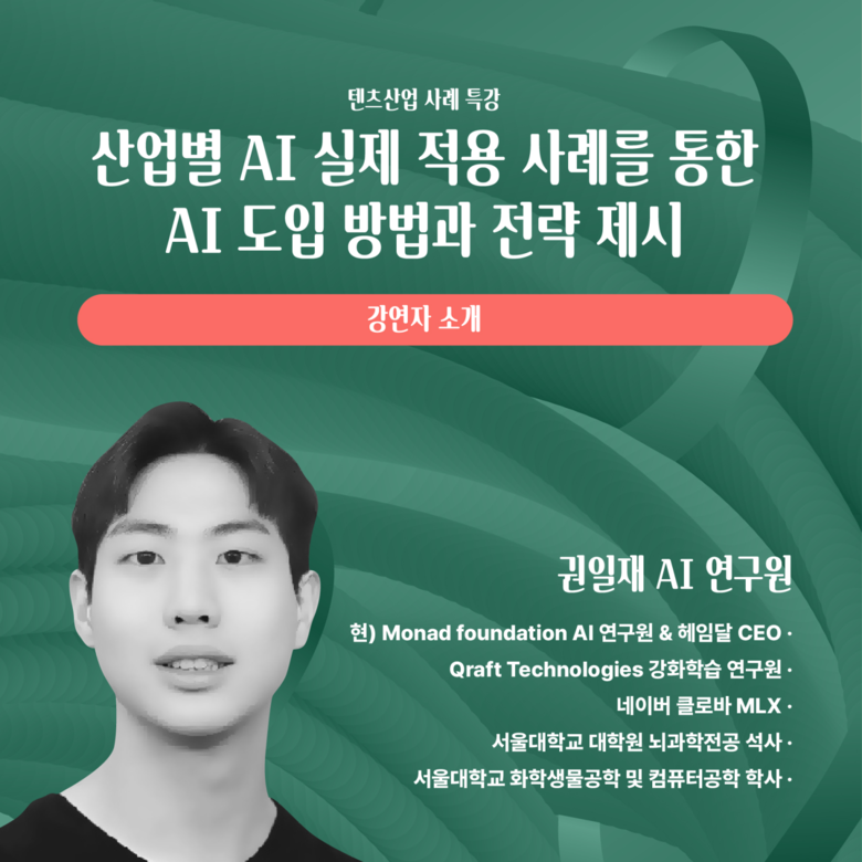 두 번째 강연자로 나서는 모나드 파운데이션 권일재 AI 연구원은 △AI 실제 적용 사례를 통한 AI 도입 방법과 전략 제시, △미국 AI 산업의 주요 흐름 및 핵심 기술 이해, △AI 시대에 필요한 기업의 변화 방향에 대해 이야기한다.
