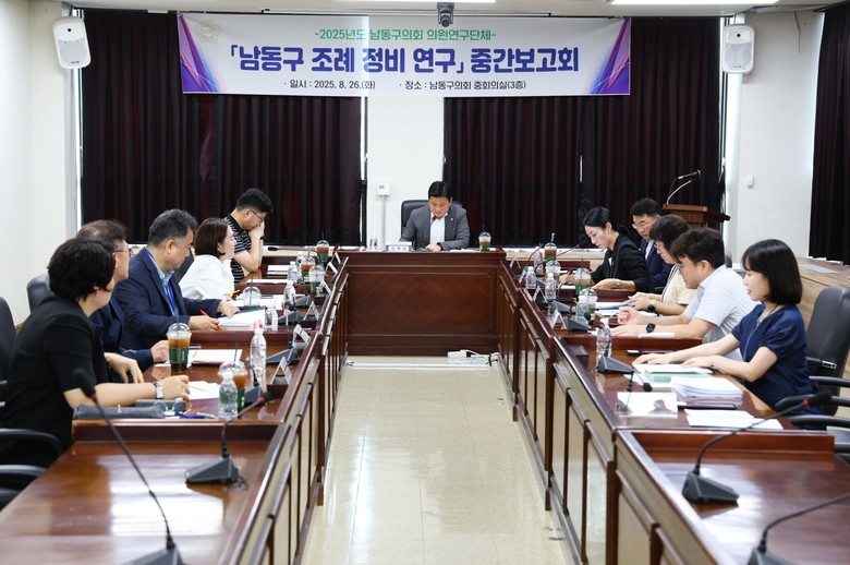 [남동구 세계타임즈=심하린 기자] 남동구의회 의원연구단체 「남동구 조례정비 연구회」가 지난 26일 남동구의회 중회의실에서 ‘남동구 조례정비 연구용역’ 중간보고회를 개최했다.