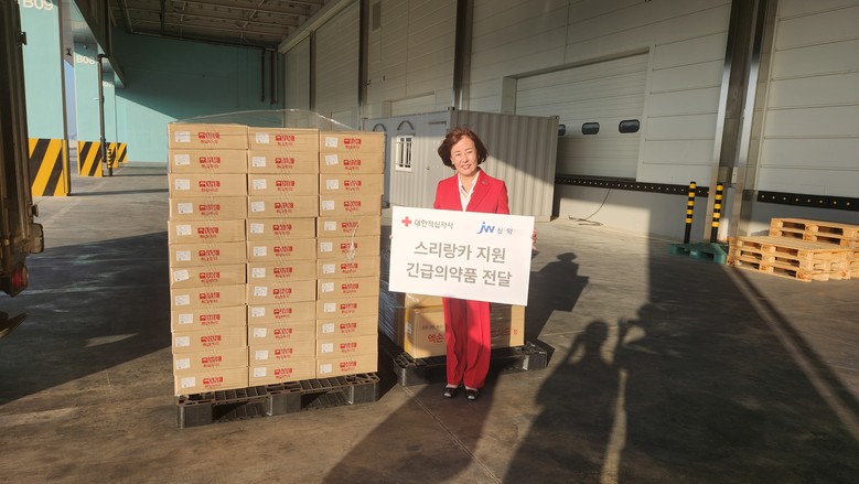 JW신약이 한국마약퇴치운동본부(KAADA) 요청에 따라 국가부도 사태로 어려움을 겪고 있는 스리랑카 국민을 지원하기 위해 대한적십자사에 의약품을 기부했다. 김필여 한국마약퇴치운동본부 이사장이 기부 의약품 전달 기념촬영을 하고 있다.