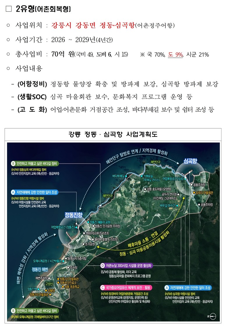 강릉 정동·심곡항은 2020년 어촌뉴딜사업을 통해 어항시설 보강과 해안단구길 연장사업을 완료한 지역으로, 이번 ‘어촌회복형(2유형)’ 사업을 통해 어촌문화거점 조성 등 기존 사업을 고도화하고, 생활 에스오시(SOC) 개선을 병행해 주민이 체감하는 지속가능한 어촌공동체 조성을 추진할 계획이다.
