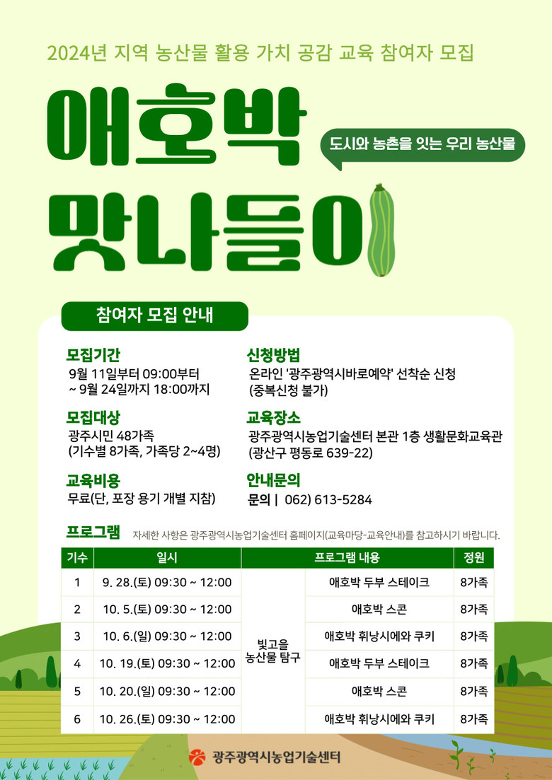 자세한 내용은 광주시농업기술센터 누리집(교육마당→교육안내)이나 융복합지원팀(062-613-5284)으로 문의하면 된다.