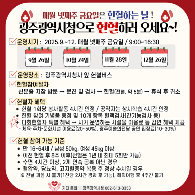 광주시는 올해 9월부터 12월까지 매월 넷째 주 금요일을 ‘헌혈 참여의 날’로 정하고, 대한적십자사 광주·전남혈액원과 협력해 오전 9시부터 오후 4시30분까지 청사 앞 시민광장에 헌혈버스를 배치·운영한다.