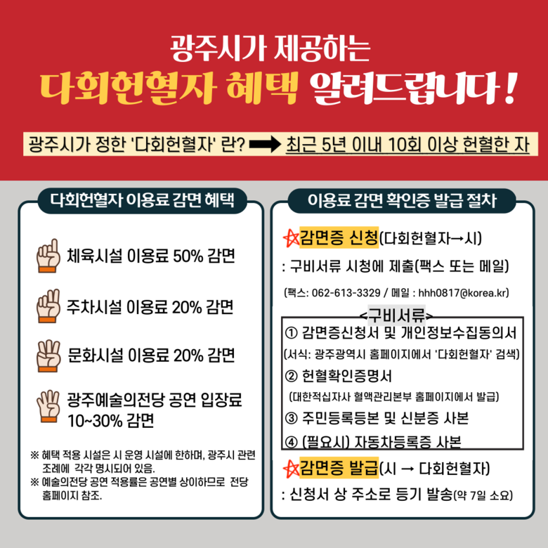 광주시는 이달부터 헌혈자 예우 지원을 위한 다회헌혈자(최근 5년 이내 10회 이상 헌혈자) 혜택을 확대·시행한다. 특히 광주예술의전당 공연 입장료 감면 혜택을 신설해 다회헌혈자는 광주예술의전당 시립예술단 공연과 전당이 단독 주최하는 기획공연 입장료를 10~30% 감면받을 수 있다.