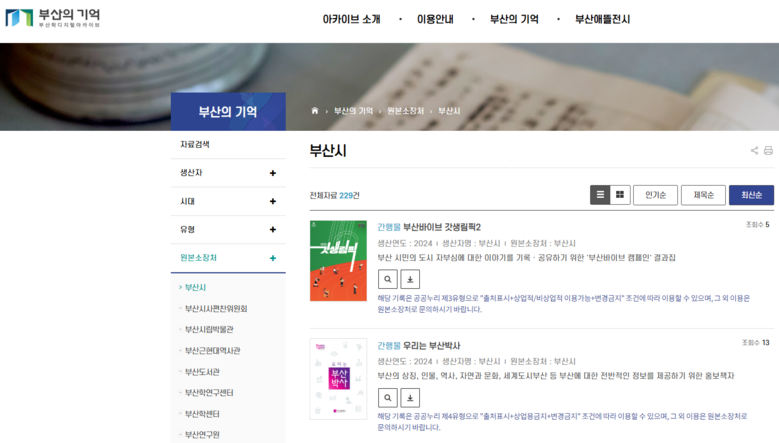 부산학 중요기록 목록과 원문 파일을 제공할 뿐만 아니라 전자책(e-book) 형태로도 제공해 이용자 편의성을 높였다.