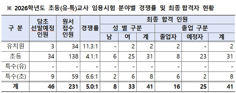이번 임용시험은 총 46명 선발 예정에 231명이 지원하여 평균 5대 1의 경쟁률을 기록했다. 특히 수험생들은 지난해 11월 실시된 1차시험(교직논술, 교육과정)부터 올해 1월 2차시험(교직적성 심층면접 및 수업실연 등)까지 이어지는 엄격하고 까다로운 검증 과정을 거쳤으며, 이를 통과한 총 41명이 최종 합격의 영예를 안았다.