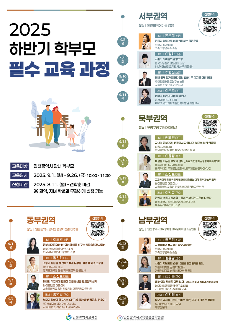 수강 신청은 11일(월)부터 QR코드를 통해 선착순 진행하며, 자세한 사항은 평생학습관 누리집(https://www.ilec.go.kr/)에서 공지사항을 확인하거나 평생교육부(☎032-899-1535)로 문의하면 된다.
