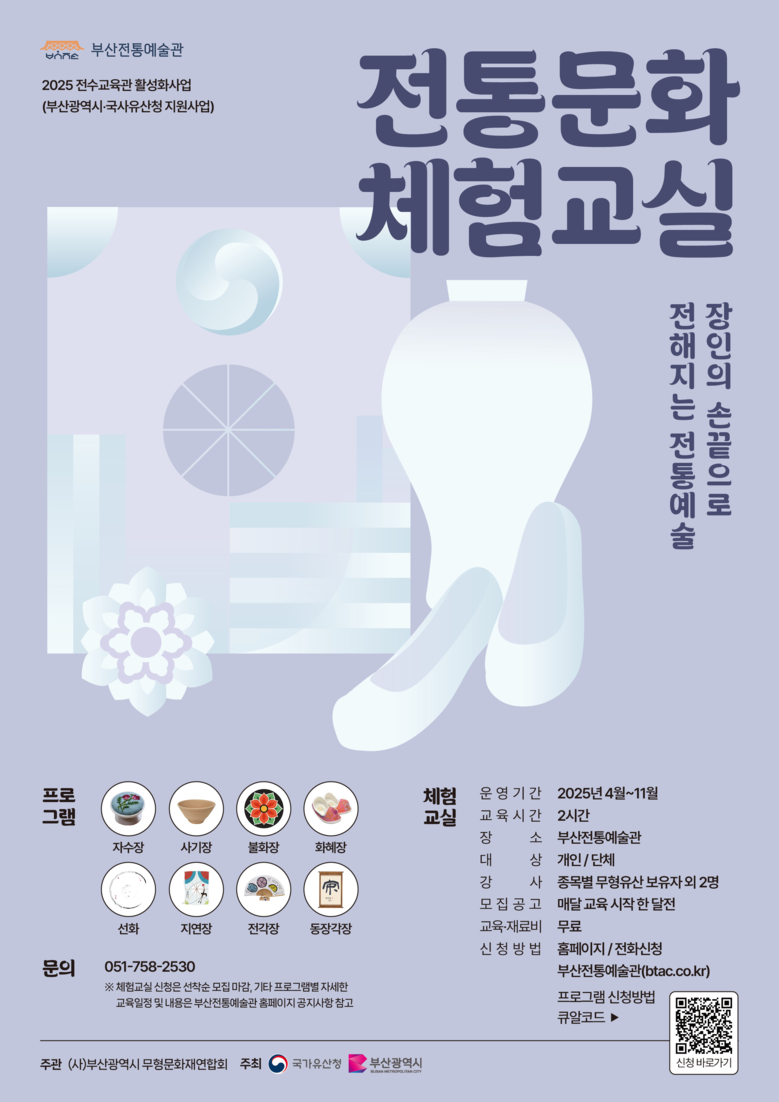 이 프로그램은 국가유산청이 후원하는 「2025년 전수교육관 활성화 사업」의 일환으로, 시는 2020년도부터 6년 연속 부산에 소재하는 무형유산 기능 분야 전승 보전을 위해 사업을 추진하고 있다.