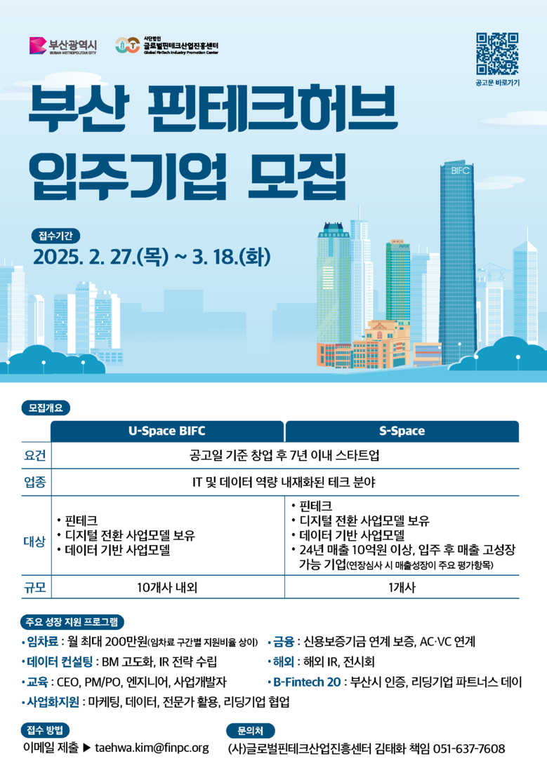 '부산 핀테크 허브'는 금융기술(핀테크) 산업의 다양성 확보와 기업 성장을 돕기 위해 시가 조성한 전문 육성 플랫폼으로, 'U(Unicorn)-Space(BIFC 11~15층)' 및 'S(Star)-Space(부산상공회의소 3층)' 두 개 공간에서 운영되며, 현재 43개의 기업이 입주해 있다.