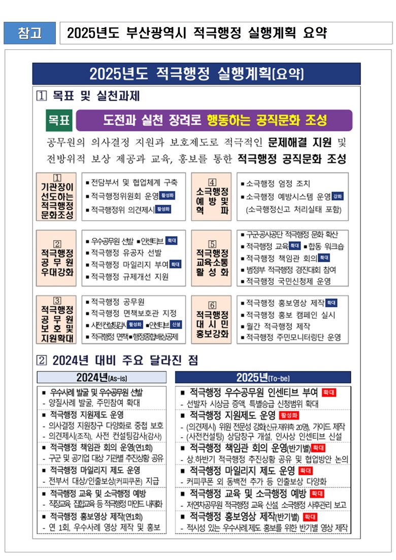◈ ▲기관장이 선도하는 적극행정 문화 조성 ▲적극행정 공무원 우대 강화 ▲적극행정 공무원 보호 및 지원 확대 ▲소극행정 예방 및 혁파 ▲적극행정 교육·소통 활성화 ▲적극행정 대시민 홍보강화 등 6대 추진전략과 26개 실천과제 수립하고 추진 [부산 세계타임즈=이용우 기자] 부산시(시장 박형준)는 시민이 행복한 도시 조성과 도시경쟁력 제고를 위해 공무원의 도전적 시도를 장려하고 보상·보호제도를 통한 적극적인 업무 추진을 지원하고자 「2025년도 적극행정 실행계획」을 수립·추진한다고 밝혔다.