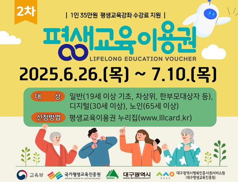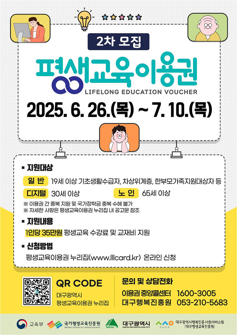▸ 디지털, 노인 이용권 등 생애주기별 평생학습 지원 확대 [대구 세계타임즈=한윤석 기자] 대구광역시는 6월 26일(목)부터 7월 10일(목)까지 디지털 교육 수요자, 노인 및 저소득층을 대상으로 ‘2025년 대구광역시 평생교육 이용권’ 이용자를 2차 모집한다.