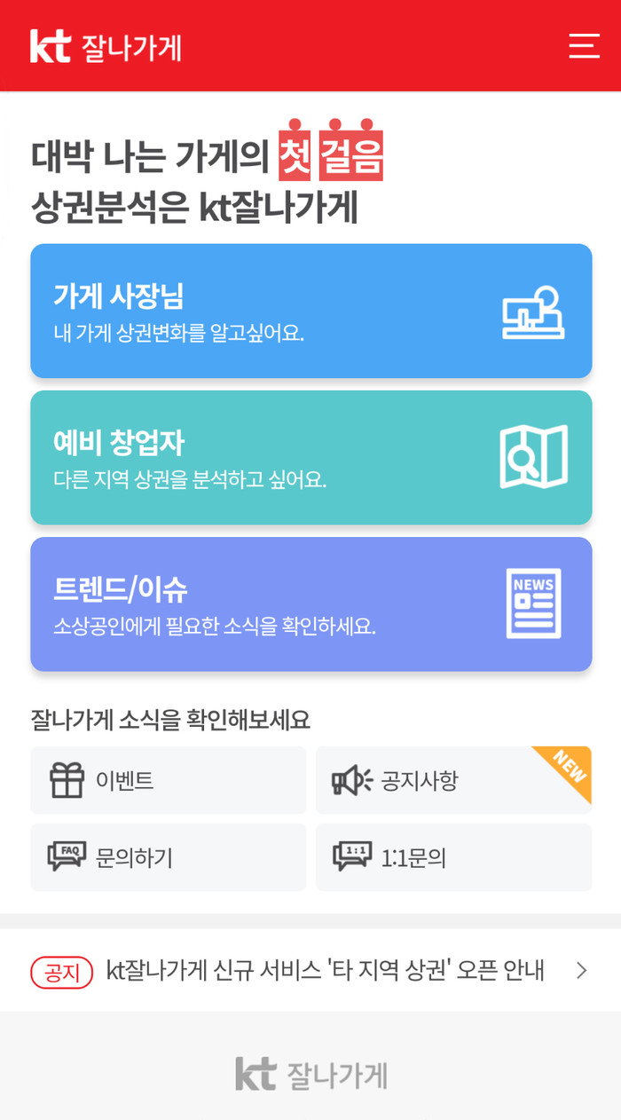 [세계타임즈 이영진 기자]KT는 소상공인 대상 무료 빅데이터 상권분석 플랫폼인 ‘잘나가게’에서 기존 사업주뿐 아니라 예비 창업자를 위한 상권분석 서비스인 ‘타지역상권’을 신규 제공한다고 28일 밝혔다.