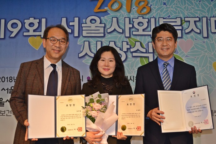 | ▲7일 오후 서울시청에서 개최된 ‘2018 서울사회복지대상’ 시상식에서 도로교통공단 수상자(좌부터 임의철 도봉시험장 면허지원부장, 강철화 강남시험장 과장, 우진구 홍보처장)들이 기념촬영을 하고 있다. |