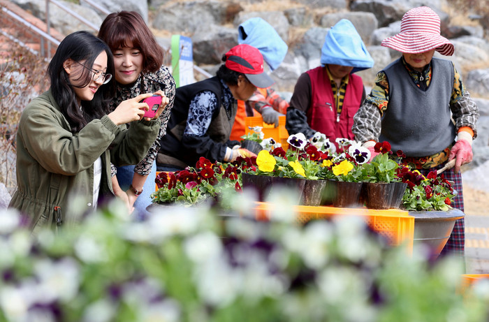 14일 대전 동구청 직원들이 구청 앞 화단에서 팬지, 비올라 등 화사하게 핀 봄꽃들을 카메라에 담으며 즐거운 시간을 보내고 있다.
