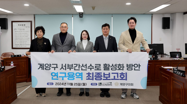 [계양구 세계타임즈=심하린 기자] 인천시 계양구의회(의장 신정숙) 의원연구단체인 ‘서부간선수로 활성화 연구회(대표의원 이상호)’가 지난 25일 의회 세미나실에서 관련 연구용역 최종보고회를 개최했다.