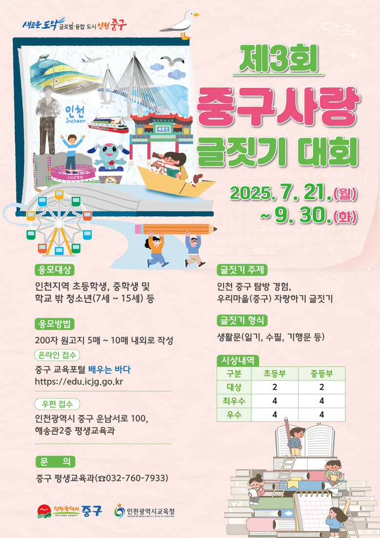 접수 기간은 오는 9월 30일까지다. 참가 희망자는 해당 기간 내에 신청서와 글짓기 작품을 우편(중구 운남서로 100, 해송관2층 평생교육과) 제출하거나, 인천 중구 교육포털 ‘배우는 바다(https://edu.icjg.go.kr)’로 제출하면 된다.