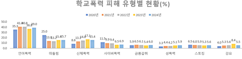 피해 응답률을 학교급별로 분석해본 결과, 초등학교, 중학교, 고등학교 모든 학교급에서 피해 응답률이 지난 5년 간 증가해왔다는 것이 이종환 의원의 설명이다. (상세 : 아래 표, 그래프) 특히, 초등학교의 경우 피해 응답률이 2020년 대비 2.9%P나 증가(’20년 1.5%→’24년 4.4%)하여 그 심각성을 더한다.