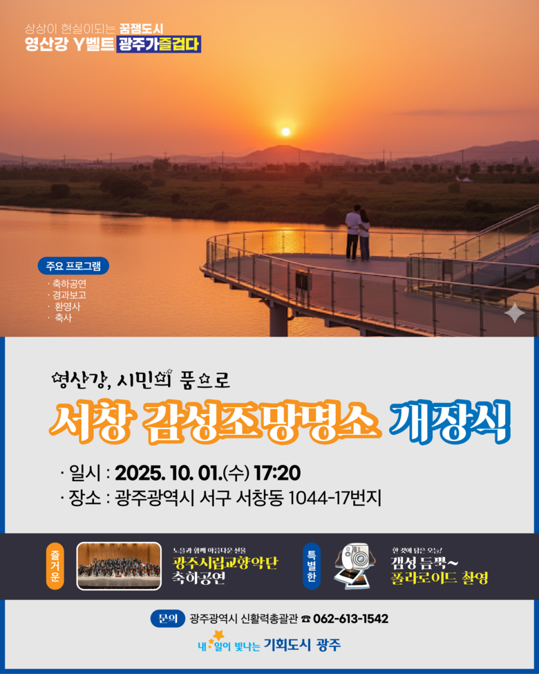 이승규 신활력추진본부장은 “서창 감성조망대는 시민과 관광객이 영산강의 아름다운 노을을 보며 감성과 문화를 함께 즐길 수 있는 공간”이라며 “서창 감성조망대가 광주의 대표 명소로 자리매김하길 기대한다”고 말했다.
