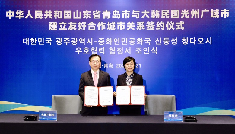 [광주 세계타임즈=손권일 기자] 광주광역시(시장 강기정)와 중국 산둥성 칭다오시가 지난 21일 칭다오시청에서 ‘우호협력도시 협정’을 체결했다.