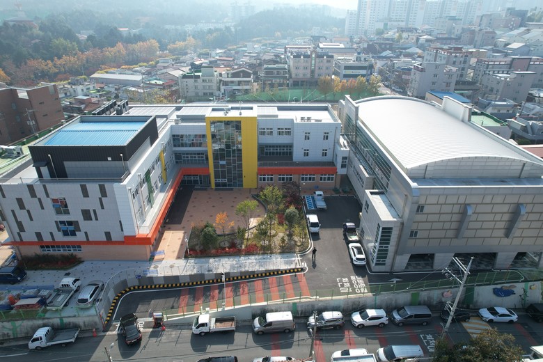 수성구 만촌동에 소재한 만촌초등학교는 이번 개축을 통해 노후 학교시설을 안전하고 쾌적한 미래형 교육 환경으로 재구성하였다. 특히 학생 이동 안전을 고려한 효율적 동선 설계와 함께 자연채광과 환기 성능을 강화하여 학습과 휴식이 조화된 건강한 실내 환경을 마련했다.