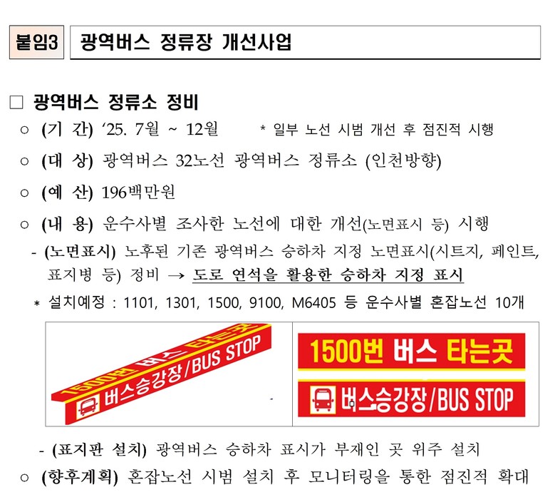 이에 따라 인천시와 운수사들은 ▲광역버스 증차를 통한 운행률 제고 ▲정류장 환경 개선* ▲M버스의 대광위 준공영제 전환 건의 및 대광위 지원 요청 등 시민 체감 만족도 향상을 위한 실질적인 노력을 지속적으로 추진해 나갈 계획이다.