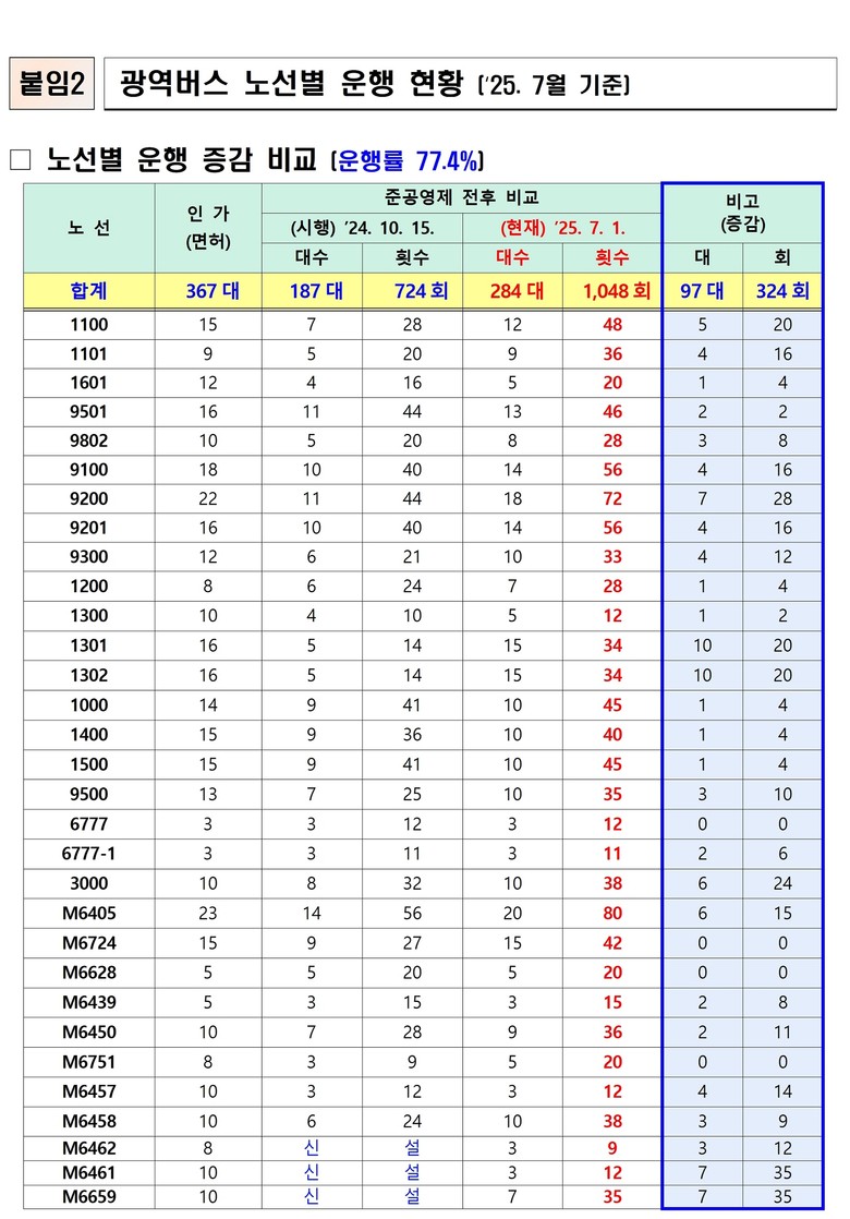 현재 인천시의 광역버스 운행 대수는 준공영제 시행 전 28개 노선 187대에서 현재 31개 노선 284대로 확대됐으며, 3개 노선 97대가 증차됐다. 시는 향후 32개 노선 320대(운행률 85%)까지 운행 확대를 계획하고 있으며, 현재 운행률은 77.4%(실 운행대수 277대 / 면허대수 367대) 수준이다.