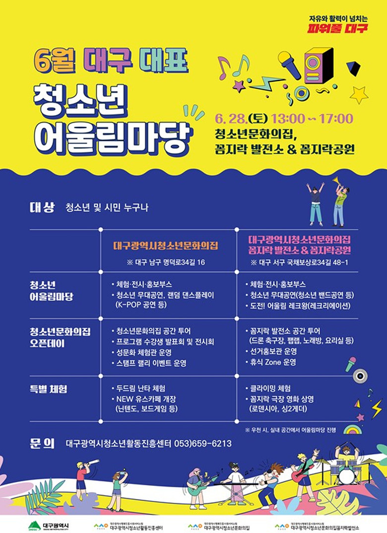 이번 청소년 어울림마당은 대구 대표 청소년 문화시설인 대구광역시청소년문화의집(남구 명덕로34길 16 소재)과 꼼지락발전소(서구 국채보상로34길 48-1 소재) 2개소에서 오픈데이로 펼쳐지며, 청소년들을 위한 다양한 체험 프로그램을 제공한다.