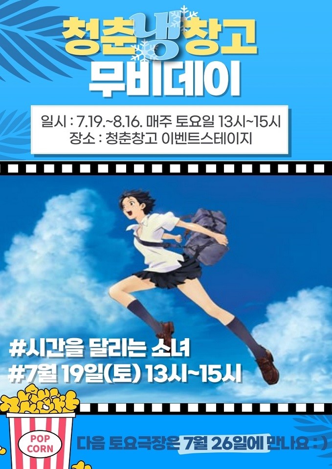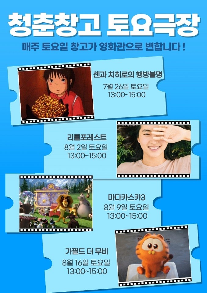 [순천시 세계타임즈=우덕현 기자] 순천시(시장 노관규)는 순천시 대표 청년공간인 청춘창고에서 여름철 도심 속 문화체험 공간 제공을 위한 ‘청춘냉(冷)창고 무비데이’를 운영한다고 밝혔다.