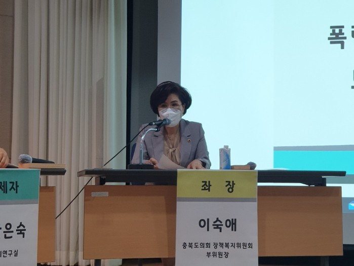 [충북=세계타임즈 이현진 기자] 충북도의회 이숙애(청주1) 의원은 15일 ‘폭력피해 장애여성 안전권 보장을 위한 정책 토론회’에 좌장으로 참여했다.