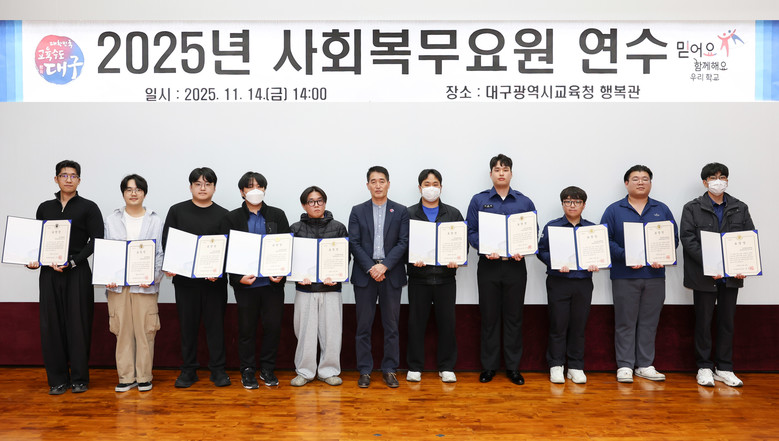 [대구 세계타임즈=한윤석 기자] 대구시교육청은 오는 11월 14일(금) 오후 2시, 시교육청 행복관에서 각급 학교에 배치되어 있는 사회복무요원 320여 명을 대상으로 ‘2025년 사회복무요원 연수’를 실시했다.