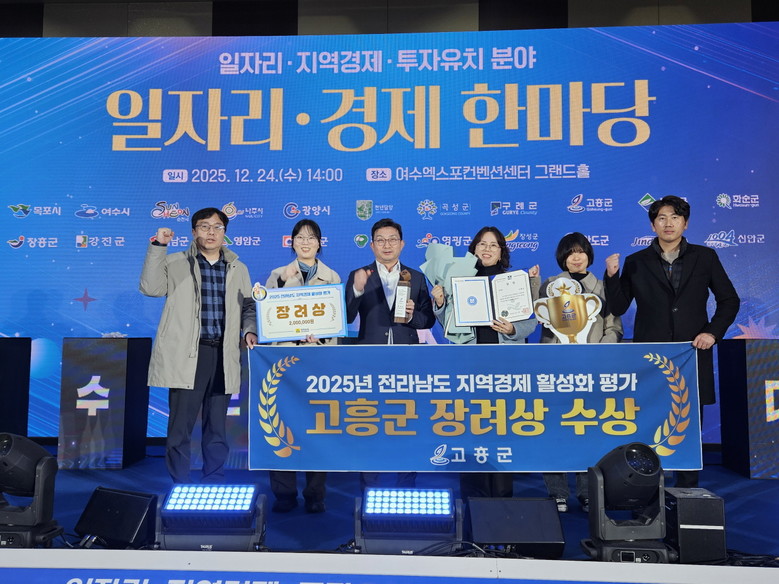 [고흥군 세계타임즈=우덕현 기자] 고흥군(군수 공영민)은 2025년 전라남도 일자리경제 한마당 행사 시상식에서 ‘2025년 지역경제 활성화 평가’ 장려상을 수상해 기관 표창과 함께 200만 원의 시상금을 받았다고 29일 밝혔다.
