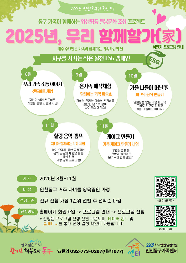 동구 양성평등기금 지원사업 공모 선정을 통해 진행되는 ‘함께할가(家)’ 는 인천동구가족센터의 경영방침인 ESG<환경(Environmental), 사회(Social), 지배구조(Governance)> 경영을 실천하여 모든 가족 구성원이 평등하게 자녀와 함께 시간을 보내 양육에 동참할 수 있도록 기획된 가족 단위 여가·문화 프로그램이다.