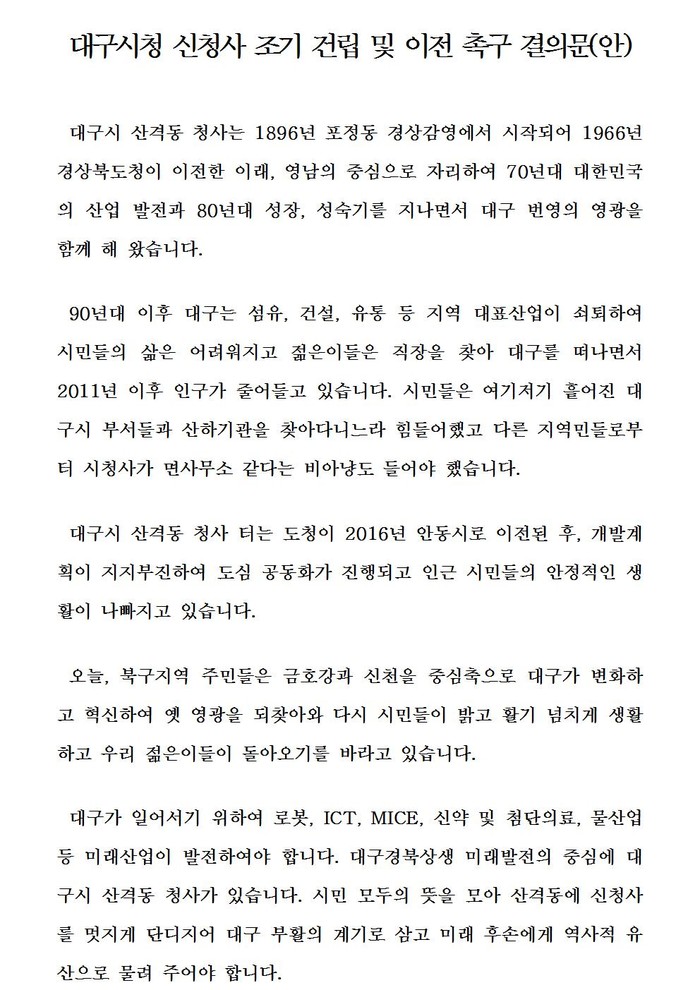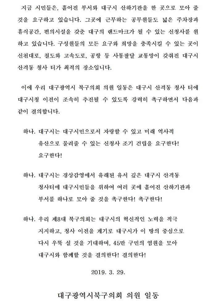 이번 결의문에는 “북구지역 주민들은 금호강과 신천을 중심축으로 대구가 변화하고 혁신하여 옛 영광을 되찾아와 다시 시민들이 밝고 활기 넘치게 생활하고 우리 젊은이들이 돌아오기를 바라고 있고, 시민 모두의 뜻을 모아 대구가 일어서기 위한 미래산업의 중심축이고 대구경북이 상생하는 대구시 산격동에 신청사를 멋지게 단디 지어 대구 부활의 계기로 삼고 미래 후손에게 역사적 유산으로 물려주어야 한다.”고 주장하였다.