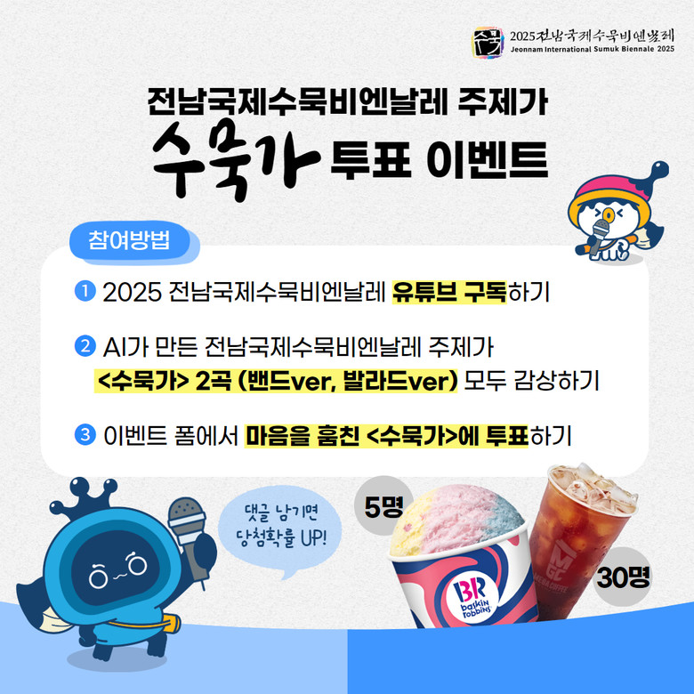 이벤트 참여를 바라는 국민은 전남국제수묵비엔날레 공식 유튜브 채널을 구독한 뒤, 인공지능이 제작한 ‘수묵가’의 밴드 버전과 발라드 버전 두 곡을 모두 감상하고, 이벤트 페이지(https://naver.me/F5aQ2mZO)에서 마음에 드는 버전에 투표하면 된다.