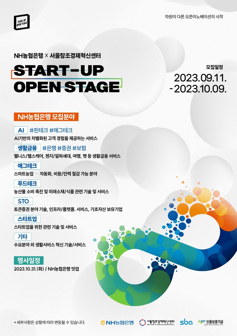[세계타임즈 = 이송원 기자] NH농협은행은 서울창조경제혁신센터와 함께 9월 11일부터 10월 9일까지 농협은행 및 범농협 계열사와 협업할 수 있는 혁신적인 스타트업을 발굴하기 위해‘START-UP OPEN STAGE’밋업을 진행한다고 12일 밝혔다.