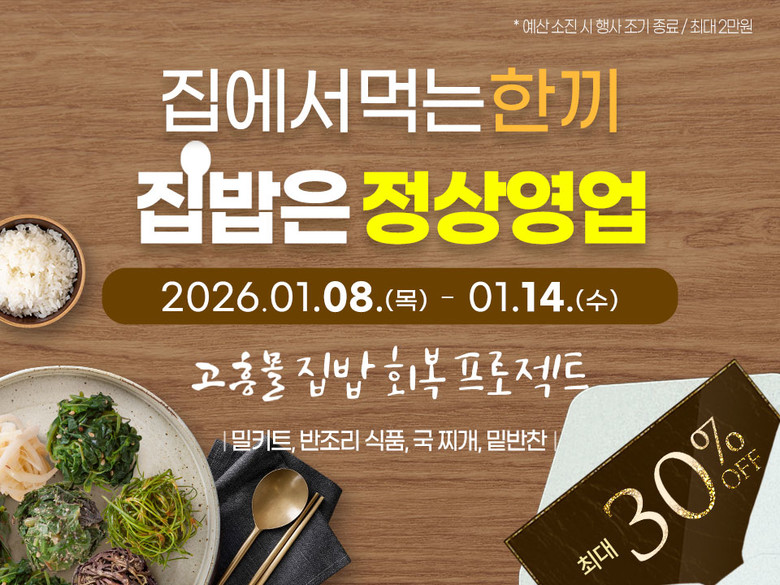 이번 행사는 ‘집에서 먹는 한 끼, 집밥은 정상영업’을 주제로, 밀키트·반조리 식품·국·찌개류·밑반찬 등 집에서 손쉽게 준비할 수 있는 상품을 중심으로 최대 30% 할인 혜택을 제공한다. 행사 기간은 1월 8일부터 14일까지다.