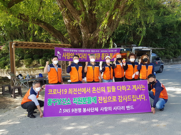 [대전=세계타임즈 이채봉 기자] 9천명 SNS 대전시 봉사단체 사랑의 사다리 밴드(리더 이정제)는 지난22일 오후4시, 코로나 19로 최전선에서 애쓰고 있는 동구보건소(소장 장선애) 직원들에게 바비큐 통닭 봉사로 우리 사회의 따뜻한 사랑을 실천하였다.