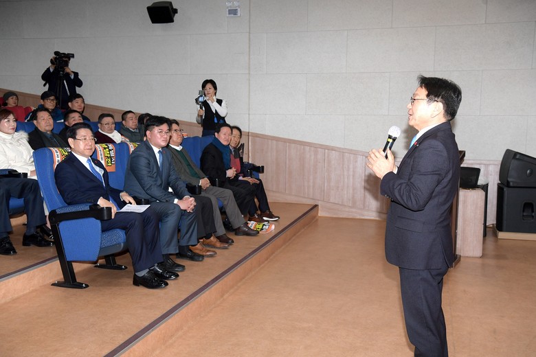 강기정 광주광역시장이 19일 시청 무등홀에서 열린 '(가칭)광주전남특별시 출범을 위한 톡 콘서트'에 참석해 참석자들과 함께 퍼포먼스를 한 후 축사를 하고 있다. /광주광역시 제공