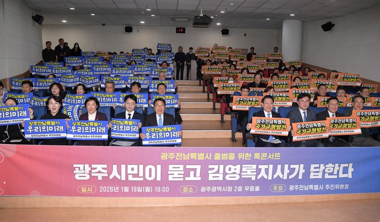 [광주 세계타임즈=손권일 기자] 강기정 광주광역시장이 19일 시청 무등홀에서 열린 '(가칭)광주전남특별시 출범을 위한 톡 콘서트'에 참석해 참석자들과 함께 퍼포먼스를 하고 있다. /광주광역시 제공