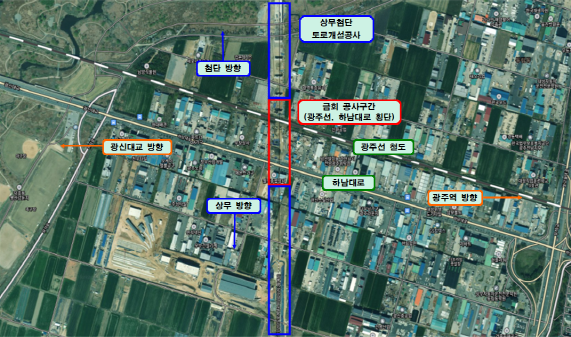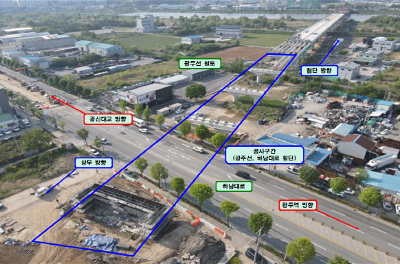 이번 부분 교통통제를 실시하는 하남대로 구간은 철도 광주선과 하남대로를 횡단하는 코스로 총 연장 880m, 폭 21m 규모의 영산강대교(가칭)를 신설하는 공사가 진행된다.