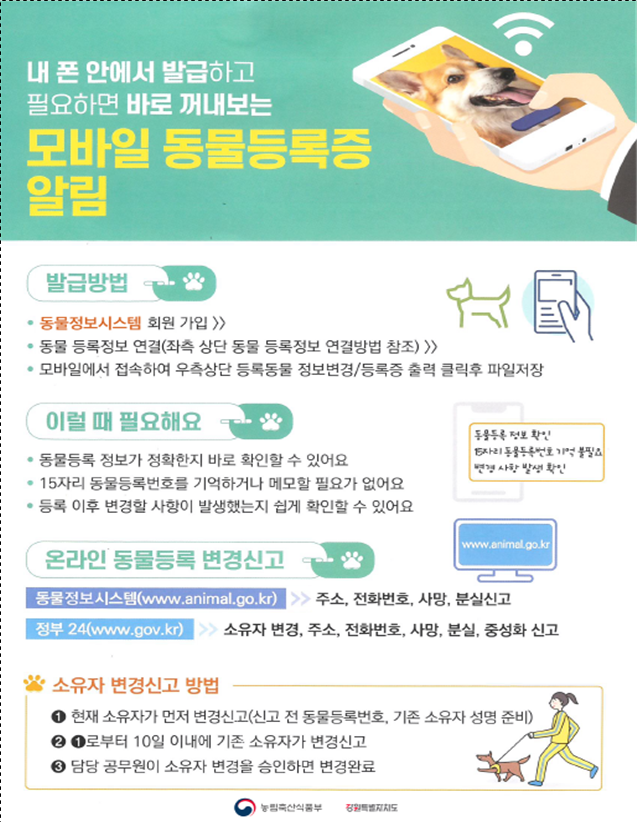 동물등록은 반려동물의 소유자, 주소‧연락처 변경이나 동물 사망 발생 시 반드시 변경 신고를 해야 하며, 동물정보시스템(www.animal.go.kr) 또는 정부24를 통해 온라인으로도 간편하게 신고할 수 있다.