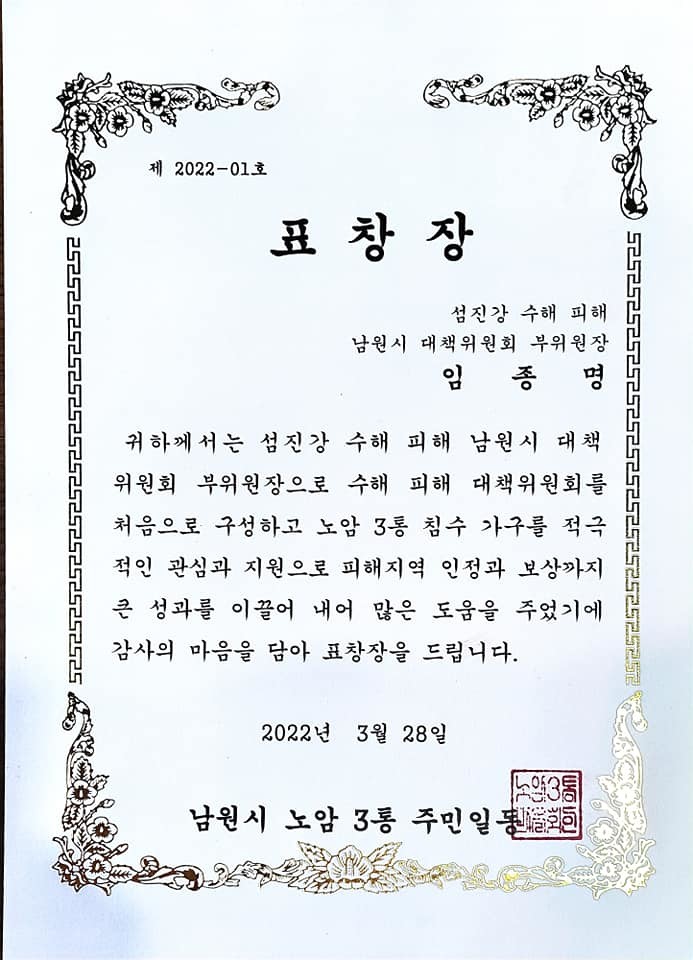 최근 임 후보가 활동한 것들을 살펴보면, 지난 3월, 2년 전 집중호우와 섬진강댐 무단 방류로 엄청난 수해피해가 있었던 것에 대해 피해지역 인정과 보상을 받기 위한 적극적인 관심과 노력을 한 공로를 인정받아 수해대책위를 대신해서 노암3통 주민의 감사의 마음을 담은 표창창을 받았다.
