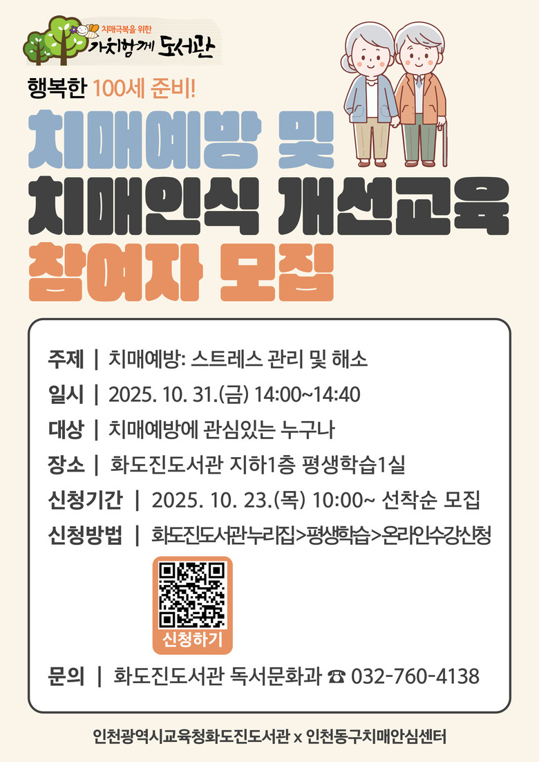 강의는 인천 시민 누구나 10월 23일(목) 오전 10시부터 화도진도서관 누리집(https://lib.ice.go.kr/hwadojin/index.do)에서 신청할 수 있으며, 자세한 사항은 화도진도서관 독서문화과(☎032-760-4138)로 문의하면 된다.