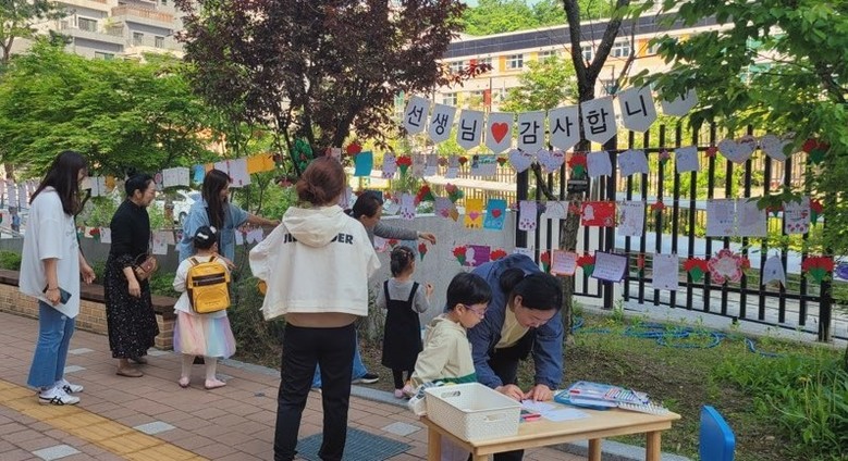 이날 아침, 유치원 등굣길 나무에는 유아들이 정성껏 쓴 손편지와 곱게 접은 종이 카네이션이 걸려 눈길을 끌었다. 아이들은 알록달록하게 그린 꽃다발과 함께 “사랑합니다”, “고맙습니다”라는 글귀를 또박또박 써내려가며 선생님들께 마음을 전했다.