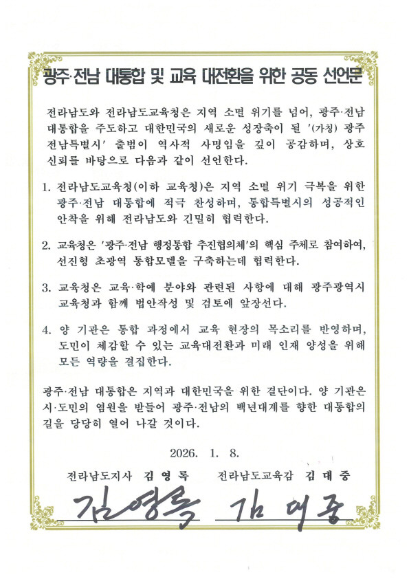 특히 지역소멸위기를 넘어 미래를 지역이 주도하고 대한민국 성장의 새로운 축으로서 ‘(가칭)광주전남특별시’ 출범이 시대적 소명이라는데 뜻을 같이하고, ‘광주·전남 대통합 및 교육 대전환을 위한 공동 선언문’에 서명했다.