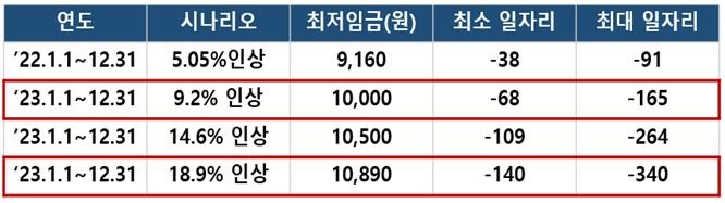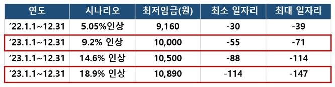 전국경제인연합회(이하, 전경련)는 최남석 전북대 교수에게 의뢰해 진행한「최저임금 상승이 일자리에 미치는 영향(2022)」보고서를 통해 내년도 최저임금 인상률에 따른 시나리오별 일자리 감소 규모를 제시했다.