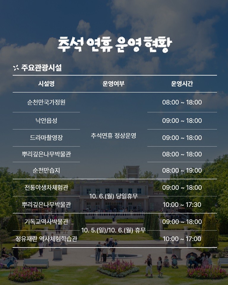 시 관계자는 “올해 추석 연휴는 순천 전역이 하나의 거대한 문화·관광 특집 무대가 된다”며 “관광객들에게는 잊지 못할 추억을, 시민들에게는 풍성한 명절 분위기를 선사하겠다”고 말했다.