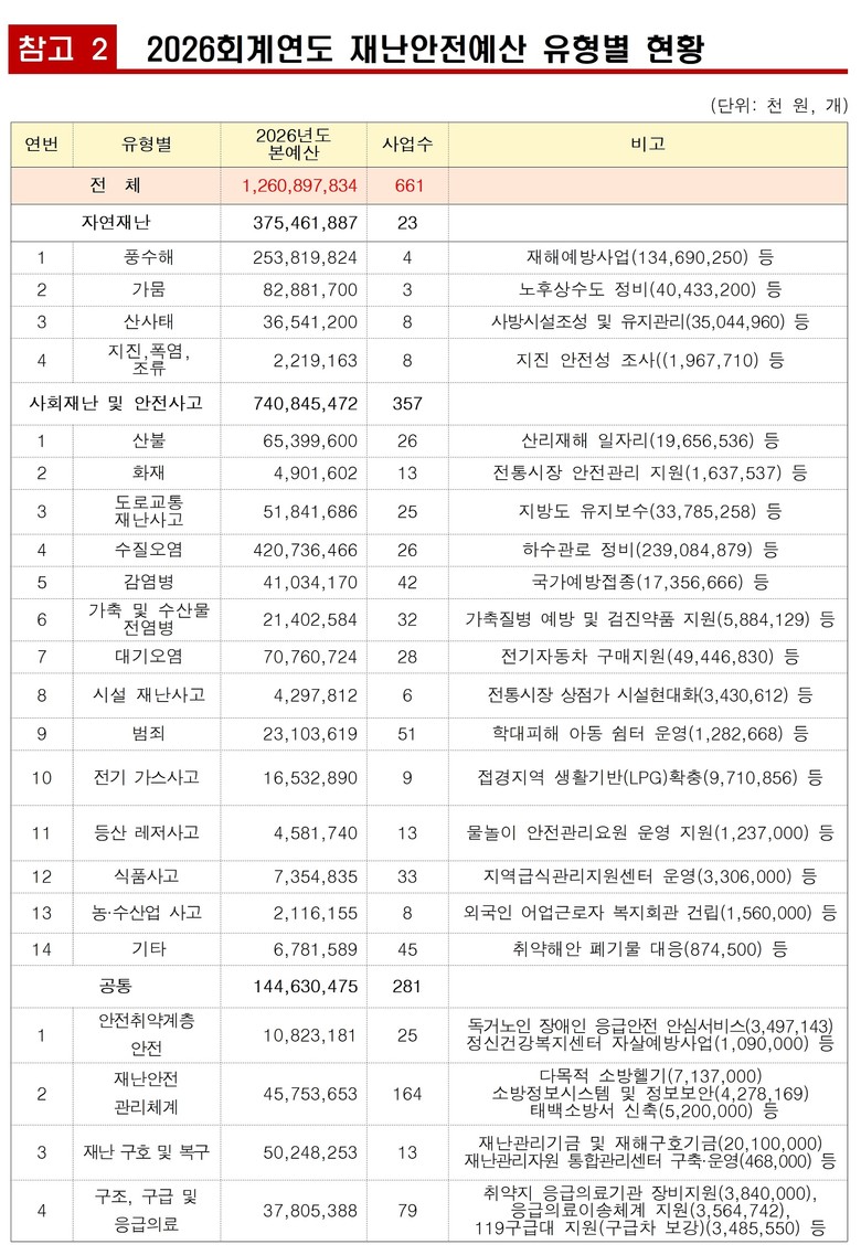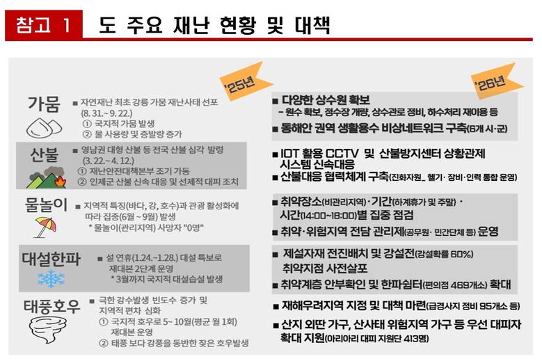 특히, 작년 당초 예산 대비 약 4,400여억 원(53.6%)이 추가된 재난안전분야 총 1조 2,609억 원(국·도비, 기금 포함) 규모 투자계획(▴재해위험 정비(450억 원) ▴배수 개선(226억 원) ▴지방·국가 하천 보수(63억 원) ▴재해취약 지방어항 시설정비(61억 원) ▴ 지방의료원 기능 특성화 및 감염병 예방(97억 원) 등)을 반영한 206개 세부대책으로 도민 체감형 안전 혁신 전략이 대폭 포함됐다.