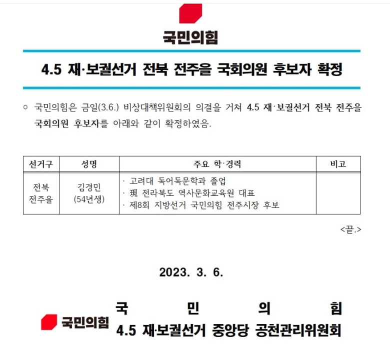 [세계타임즈 백진욱 기자] 국민의 힘 4·5 재·보궐선거 중앙당 공천관리위원회가 지난 6일(월) 4·5 재·보궐선거 전북 전주을 국회의원 후보자로 김경민 국민의힘 전북도당 고문을 공천 의결했다.