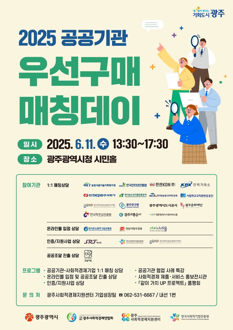 자세한 내용은 광주사회적경제지원센터 누리집(www.gjsec.kr)이나 광주사회적경제지원센터 기업성장팀(062-531-6667~8)으로 문의하면 된다.