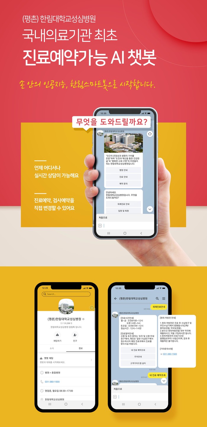 한림대학교성심병원 한림스마트봇을 이용하면 자연어처리 기술로 학습한 알고리즘을 활용해 병원이용 전반부터 진료시간표, 진료과 정보, 교수진 소개 등을 확인하거나 검색어로 찾을 수 있다. 또한 교수의 학회참석 및 휴가 등의 변동사항이 실시간 반영된 진료정보를 볼 수 있어 차별화된 챗봇의 기능을 제공한다.